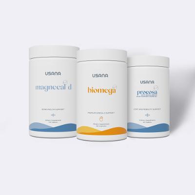 Our Get Up + Go Bundle offers three high-quality USANA supplements for comprehensive bone, joint, and cardiovascular support. Help your body keep up with your active lifestyle with Procosa, MagneCal D, and BiOmega:*