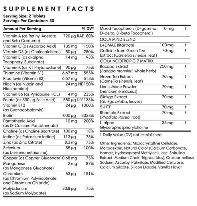 Oola Mind is a cutting-edge multivitamin designed to revolutionize your cognitive health and stress management. At the heart of Oola Mind lies the proprietary Nootropic 7 Matrix, a unique blend that not only supports but enhances your brain's ability to handle stress and cognitive demands. This is not just any supplement; it's a gateway to the future of cognitive enhancement, offering comprehensive nutritional support alongside advanced nootropics to boost brain function, memory, focus, and overall mental clarity.*
